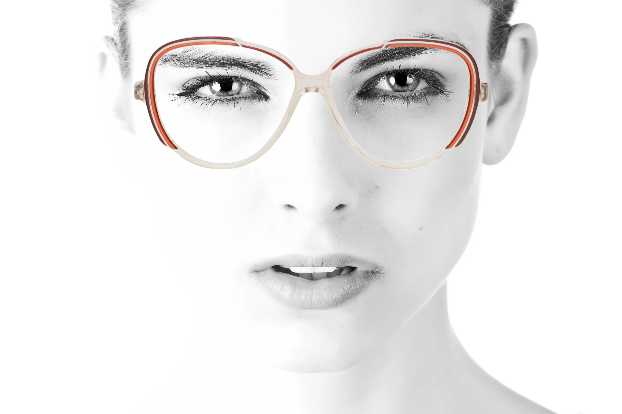Stand out from the crowd in these unique 70s deadstock vintage frames by Aspect, model 772 845. Softened cateye shape in clear crystal acetate with retro 70s orange and brown piped detailing and skinny sides.