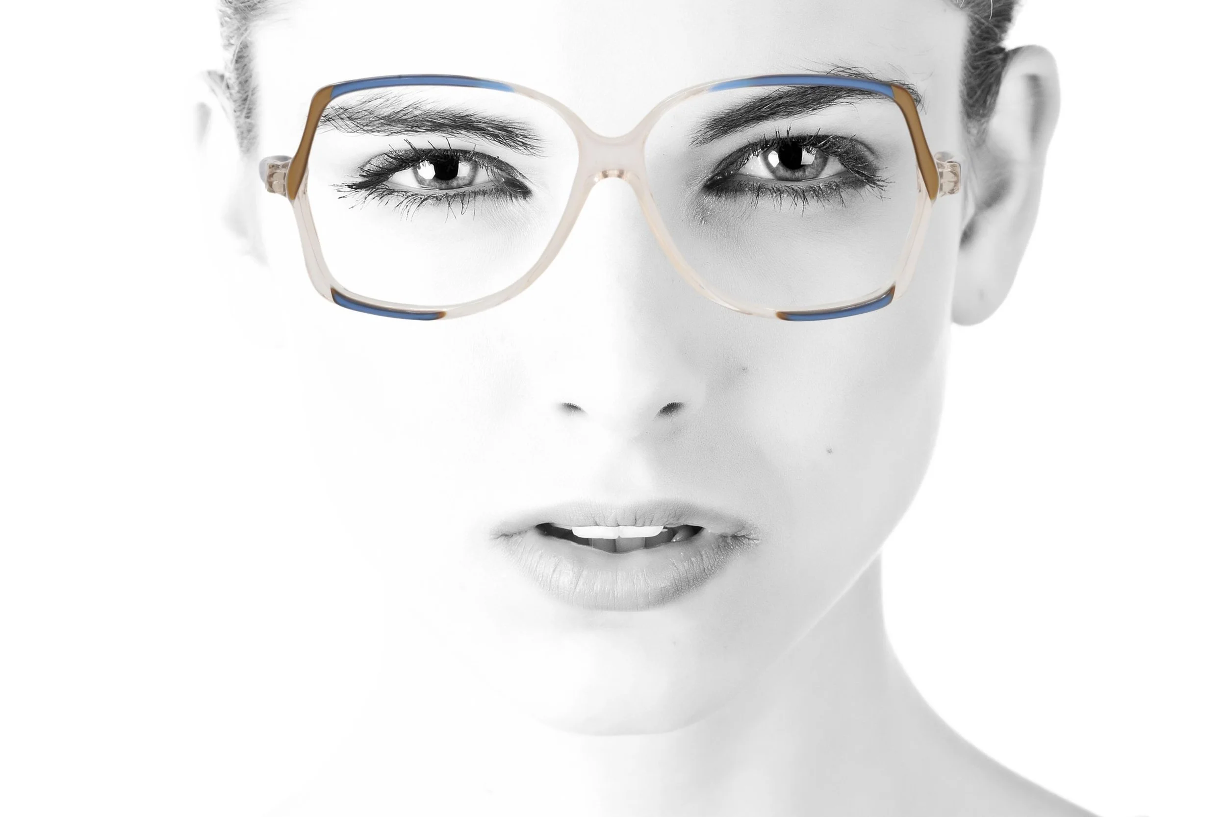 Stand out in sustainable style in these unique 80s deadstock vintage frames by Aspect, model 865 204. Geometric butterfly shape in clear crystal acetate with electric blue and old gold highlights and skinny sides.