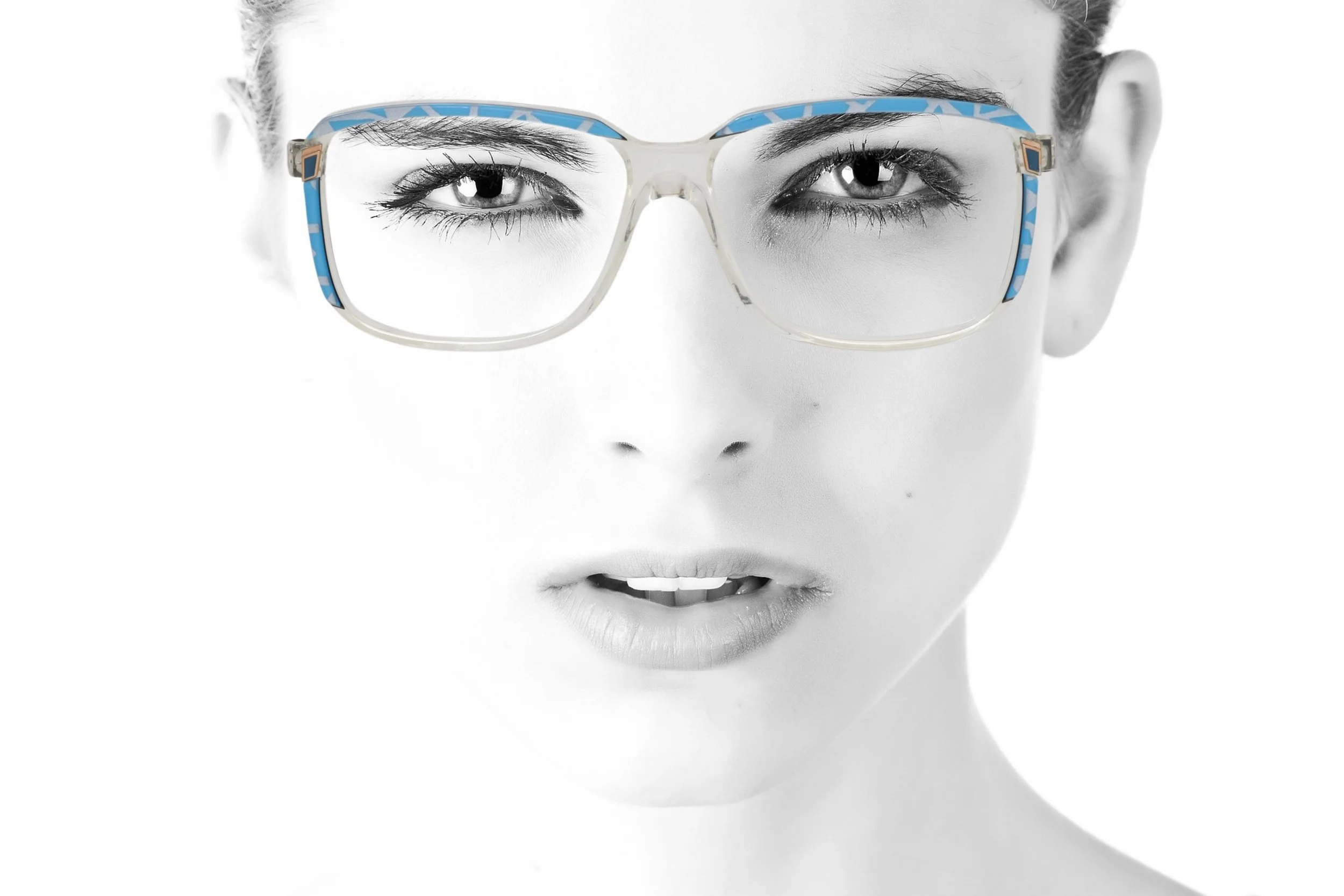 Make it statement in these unique 80s deadstock vintage frames by Aspect, model 917 333. Rectangular shape in clear crystal acetate with eighties mosaic design in electric blue on grey with enamel jewel detail and slim sides.